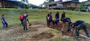 Gotong Royong Pembukaan Lahan Lapangan Voli, Satgas Pamtas RI-MLY Yonif Raider 200/BN Beri Motivasi Warga Perbatasan Untuk Gemar Berolahraga