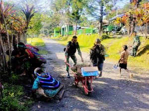 Satgas Yonif Raider 142/KJ melaksanakan kerja bakti bersama masyarakat di Kampung Kelila, Distrik Kelila, Kabupaten Mamberamo Tengah, Papua Pegun
