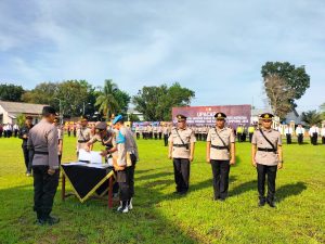 Kapolres Musi Banyuasin, AKBP Siswandi S.Ik, S.H, M.H, memimpin upacara serah terima jabatan empat Kapolsek dan Kasi Was Polres Muba, bertempat d