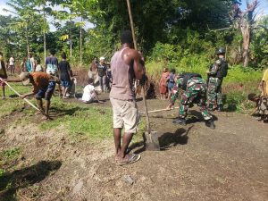 Kemanunggalan Satgas Yonif 126/KC Laksanakan Karya Bakti Bersama Warga Perbatasan Papua