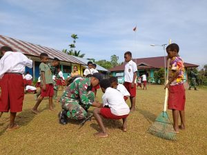 Ajarkan Peduli Lingkungan Sejak Dini, Satgas Yonif 126/KC Ajak Siswa-Siswi SD Bersihkan Sekolah