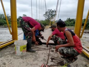 Prajurit TNI Yonif 131/Brs Bantu Perbaiki Jembatan Gantung Yang Rusak Akibat Banjir