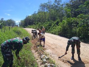 Mewujudkan Kenyamanan Berkendara, Yonif 642/Kapuas Laksanakan Karya Bakti Perbaiki Jalan