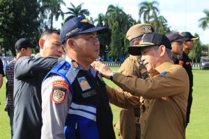 Bupati Ogan Komering Ilir (OKI), H. Iskandar, SE memimpin apel gelar pasukan Operasi Ketupat Lebaran 2023, di Lapangan Pemkab OKI, Senin (17/4/20