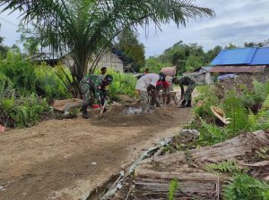 Personel Satgas Pamtas Yonif 642 Bersama Warga Desa Sungai Bening Perbaiki Jalan Setapak
