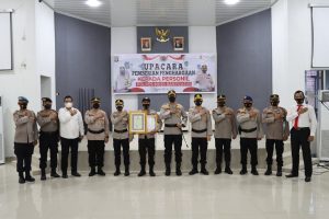 Kapolres Musi Banyuasin (Muba) AKBP Siswandi, SIK memberikan penghargaan kepada Anggota Polres Muba yang berprestasi dalam menjalankan tugas.