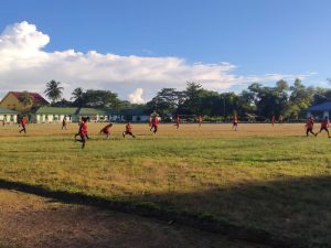 Personel Kompi Bantuan Yonif 642/Kapuas Olahraga Sepak Bola Bersama Masyarakat