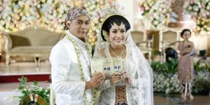 Pedangdut Shinta Bachir tak bisa menyembunyikan kebahagiaannya setelah resmi menikah dengan Indra Kristianto di Gedung Pewayangan Kautaman, Jakar