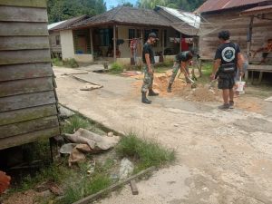 Satgas Pamtas RI-Malaysia Yonif 642/Kapuas Bersama Warga Perbaiki Jalan Desa